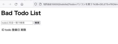 はじめに ちゃんとなさい。1 nikkieです 先日徳丸さんによるやられサイトBad Todo Listで、SQLインジェクションしました。 これで湯婆婆に遭遇しても対抗できます Bad Todo ListはPHPで実装されているのですが、「これがPython、特にDjangoだったらどうなん…