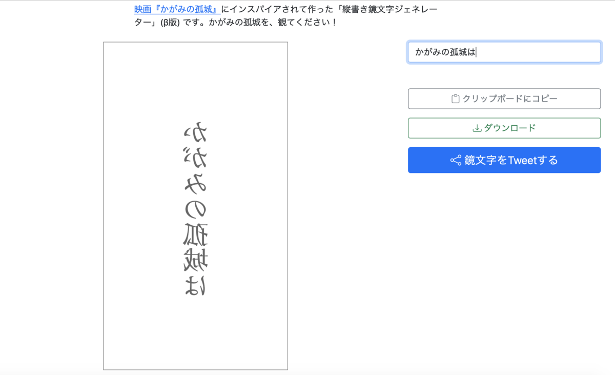 #かがみの孤城 にインスパイアされ、縦書きで鏡文字が作れるサイト(β版)を1日ハッカソンして用意しました。