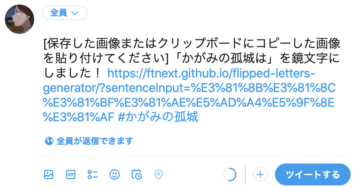 かがみの孤城にインスパイアされ、「お気に入りのジェネレーターを参考にしたら鏡文字版ができるかも」と、1日ハッカソンして作ったものを共有しました。
